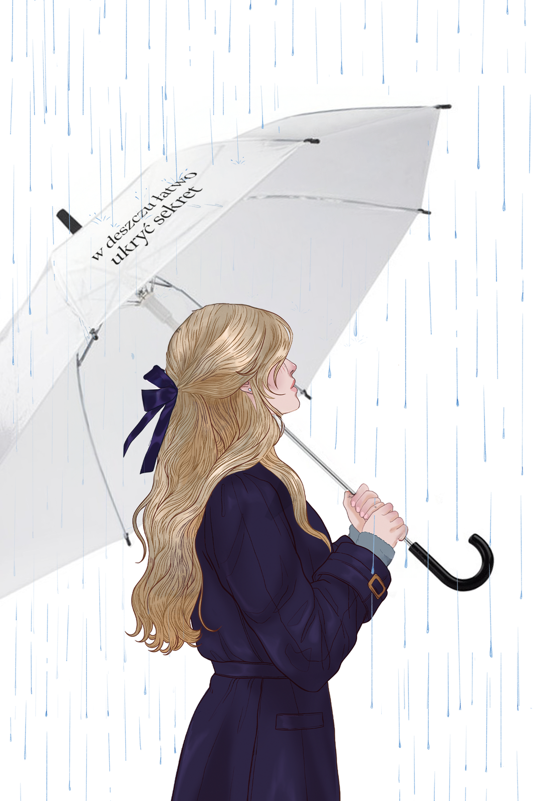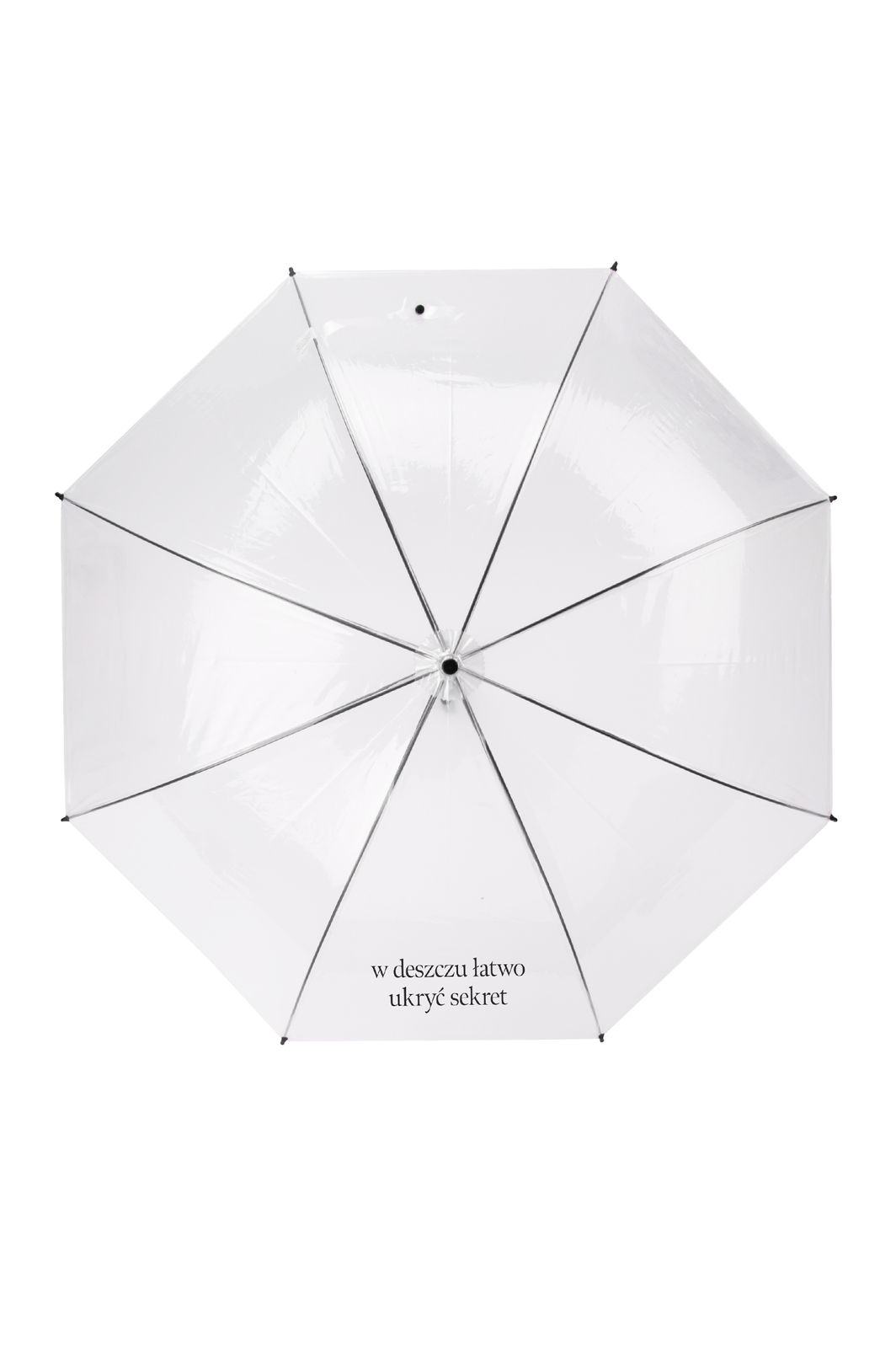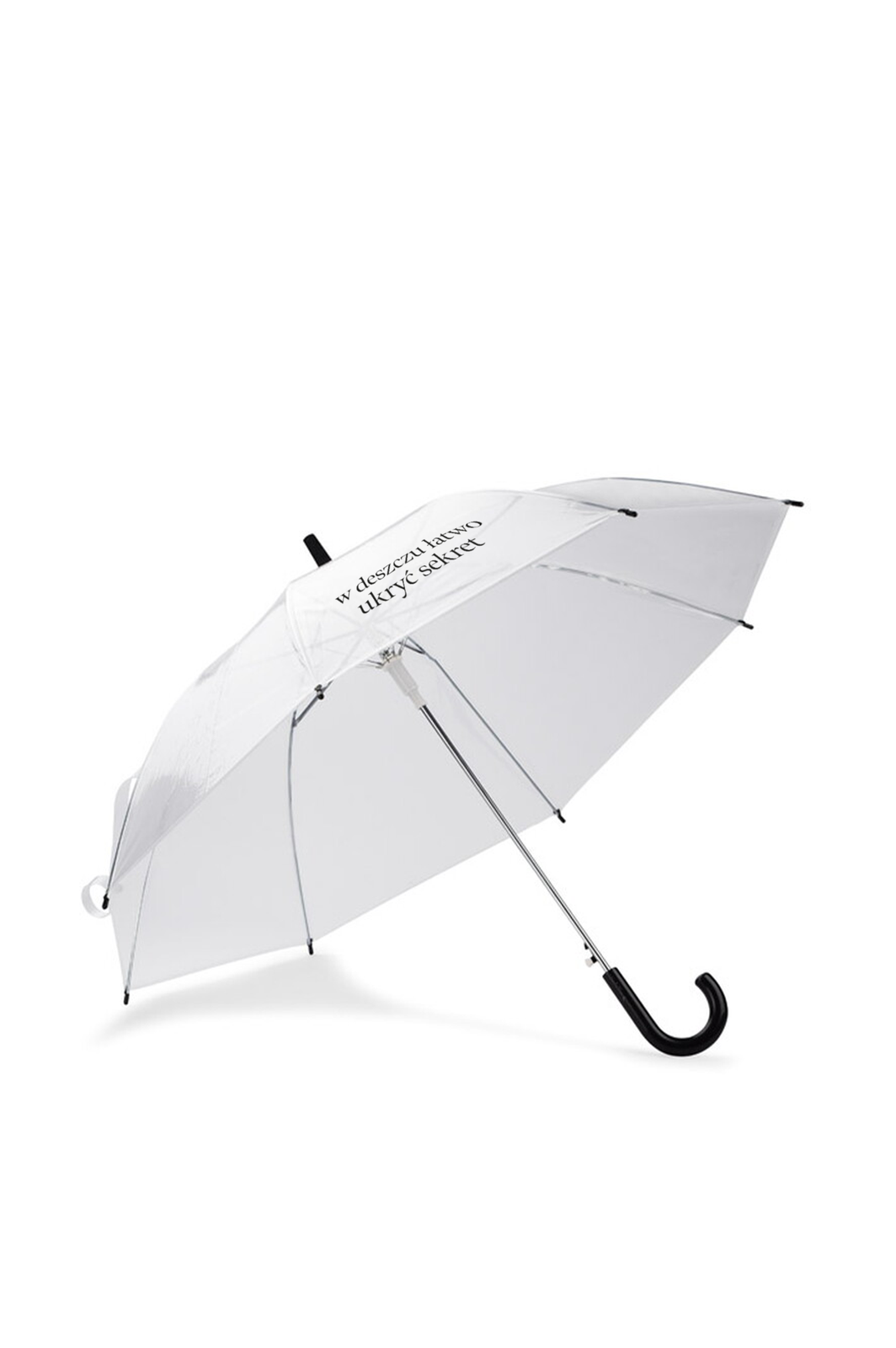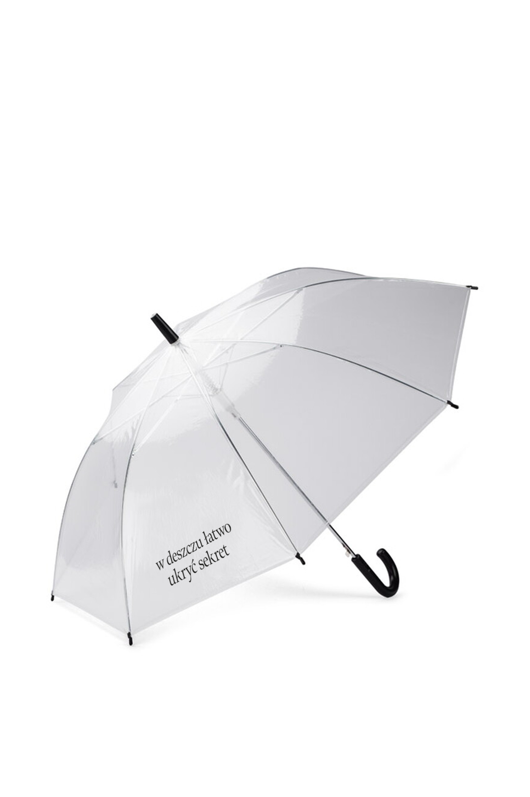 Parasol z foliowym, transparentnym poszyciem, wzbogacony cytatem z książki "Sekret rodziny Monet". Średnica czaszy po rozłożeniu 90 cm a długość złożonego parasola 73 cm.