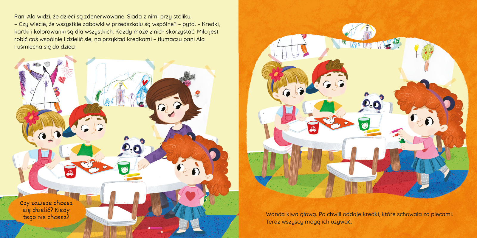 Są takie dni, kiedy dzieci nie chcą podzielić się swoją zabawką, książką lub czymś, co bardzo lubią. To naturalne – Wanda też tak ma. Dziś zrozumie, że dzielenie się to nie coś, co trzeba robić, ale coś, co przynosi prawdziwą radość. Przypomni też innym, że ma prawo do chociaż jednej zabawki, która jest tylko jej. Dzięki temu czuje się bezpiecznie i komfortowo.